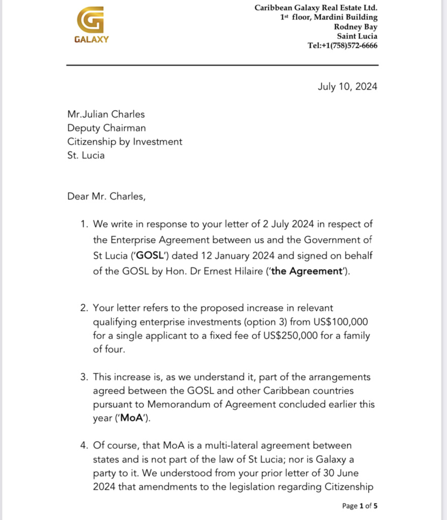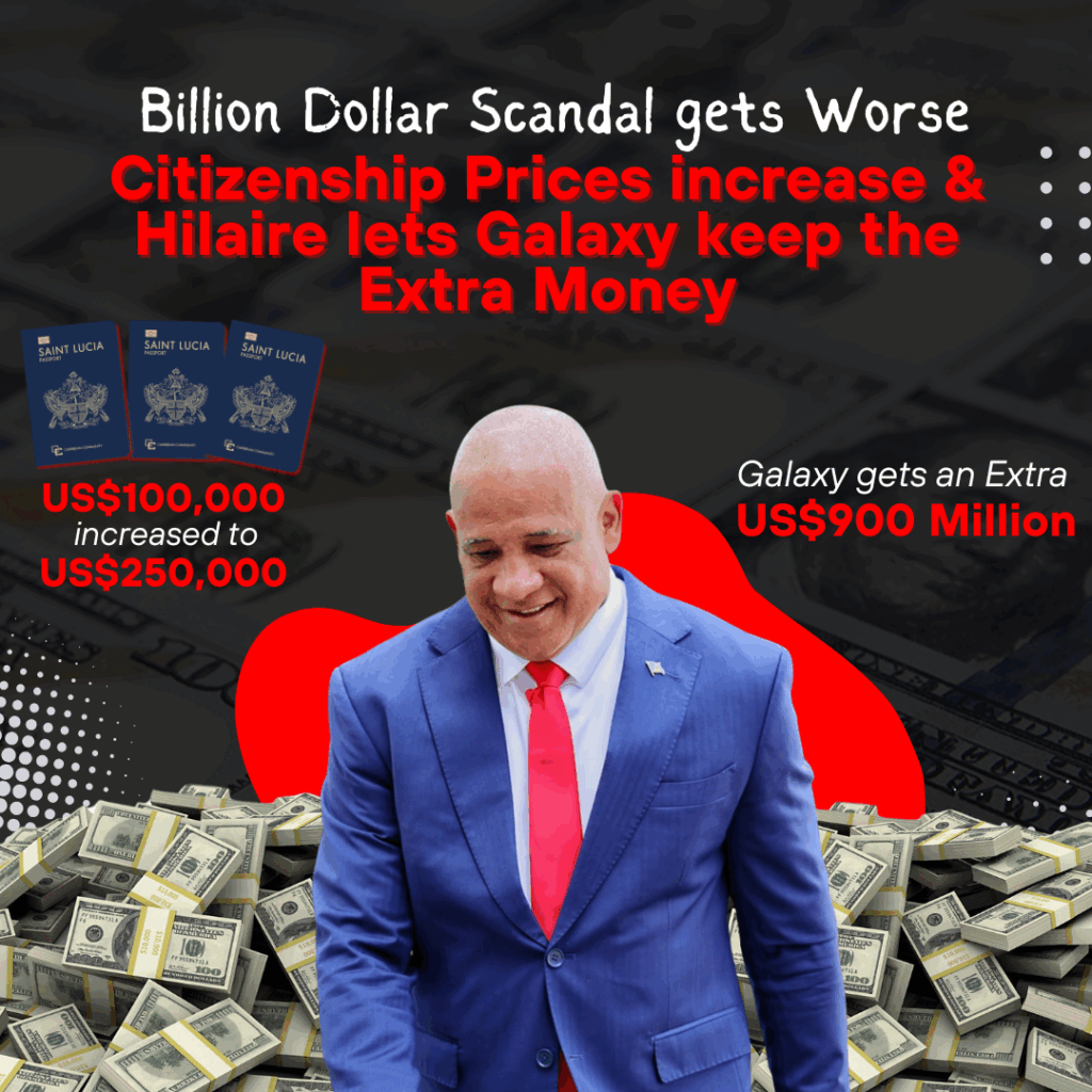 Ernest Hilaire has once again sold out the people of Saint Lucia. A recently exposed letter from Caribbean Galaxy to the Citizenship by Investment Unit reveals that Hilaire signed a contract allowing Galaxy to pocket the extra funds when the price of citizenships increased from US$100,000 to US$250,000.