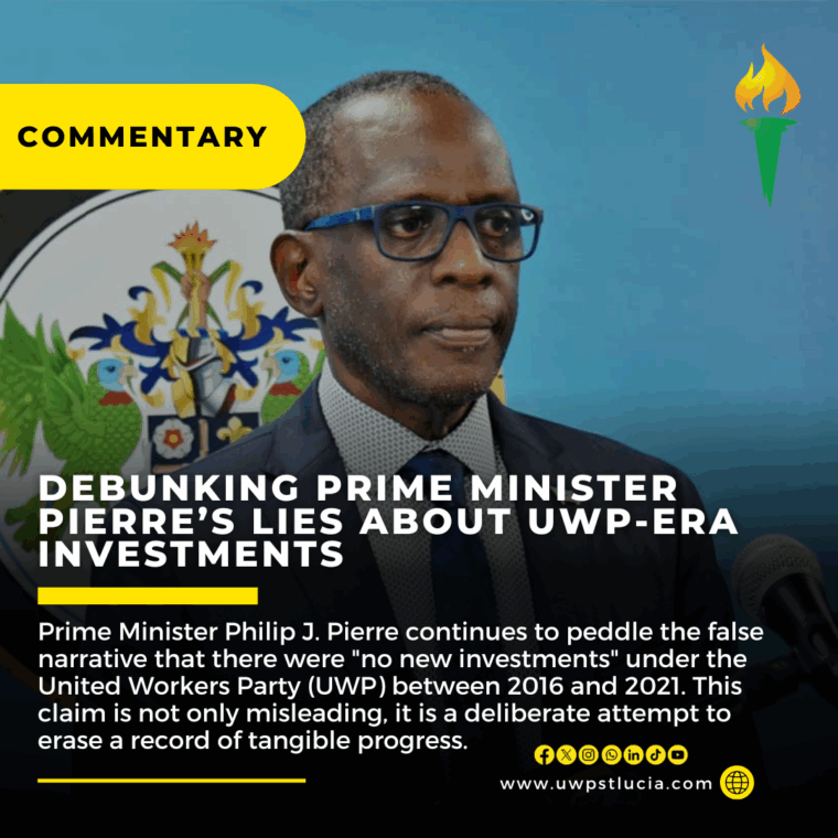 Prime Minister Philip J. Pierre continues to peddle the false narrative that there were “no new investments” under the United Workers Party (UWP) between 2016 and 2021. This claim is not only misleading, it is a deliberate attempt to erase a record of tangible progress. Despite the global disruption caused by the COVID-19 pandemic, the UWP administration successfully attracted a…
